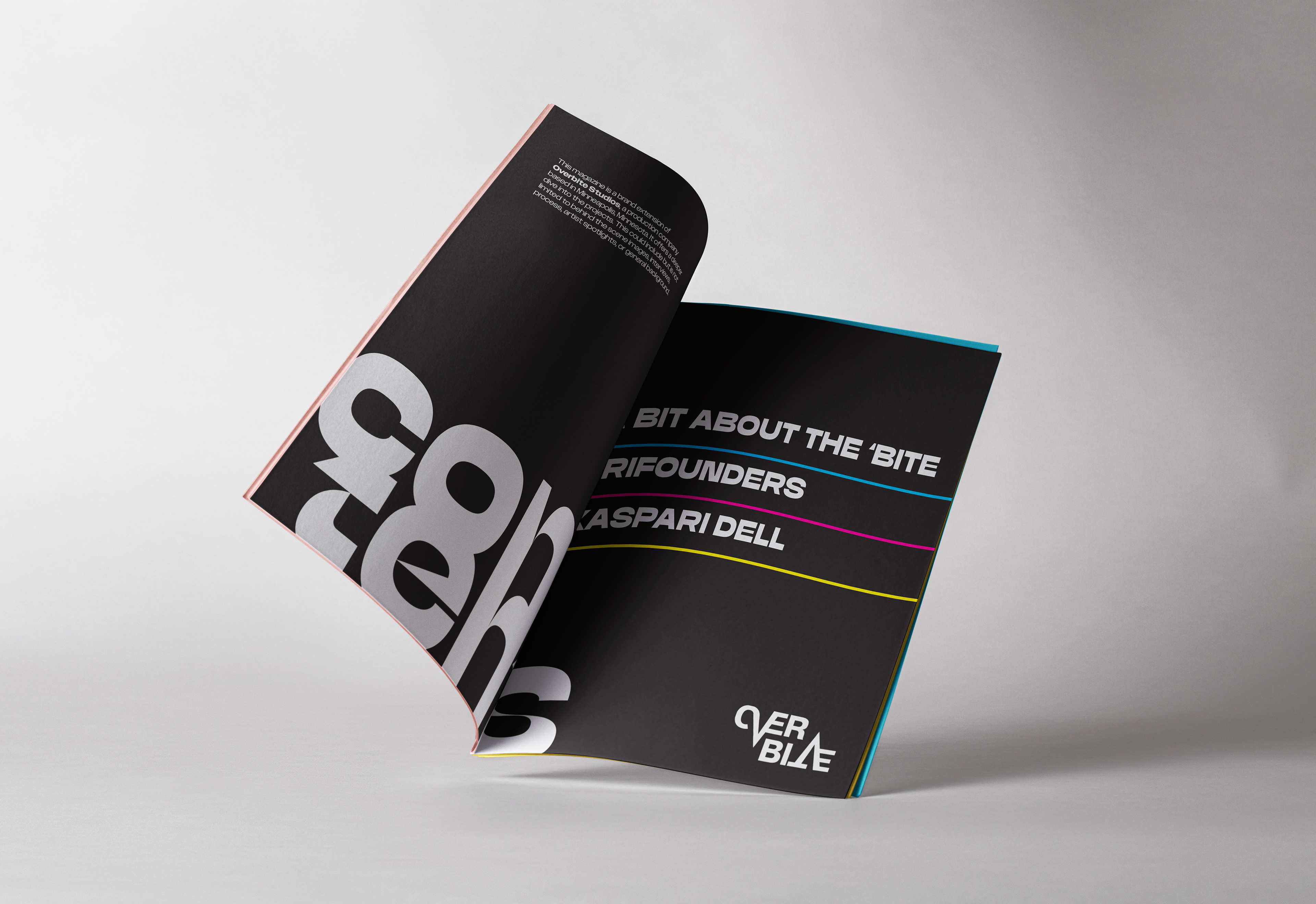 Create a brand extension in the form of a print & digital magazine for the production company, Overbite. Build on the existing identity, using brand guidelines to design a fresh logo.